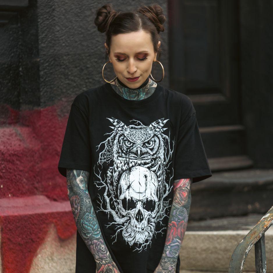 Das Skull Owl Shirt kombiniert düstere Gothic Symbolik mit hochwertiger Bio-Baumwolle. Ausdrucksstarker Frontprint, angenehmer Tragekomfort und ein zeitloser Unisex-Schnitt machen dieses Shirt zur idealen Wahl für Dark Fashion Fans, Festivals und den Alltag. Perfekt für alle, die Individualität zeigen wollen.