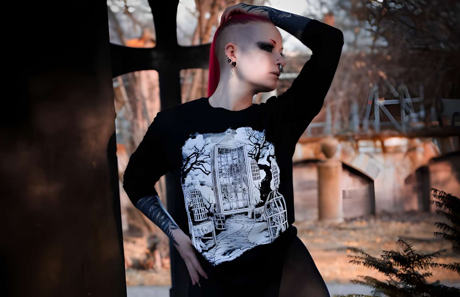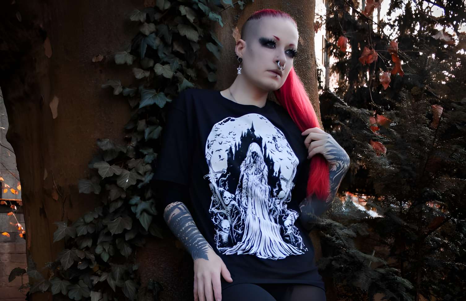 Klassiker: schwarze Jeans, Leggings, Röcke, Platform-Boots oder Chucks. Ergänze deine gothic shirts mit Dark-Art-Schmuck, Chokern, Ringen und Accessoires aus unserem Sortiment auf EASURE. Für kältere Tage passen unsere Gothic Hoodies perfekt über dein Shirt – so bleibt dein Look auch im Layering stimmig.