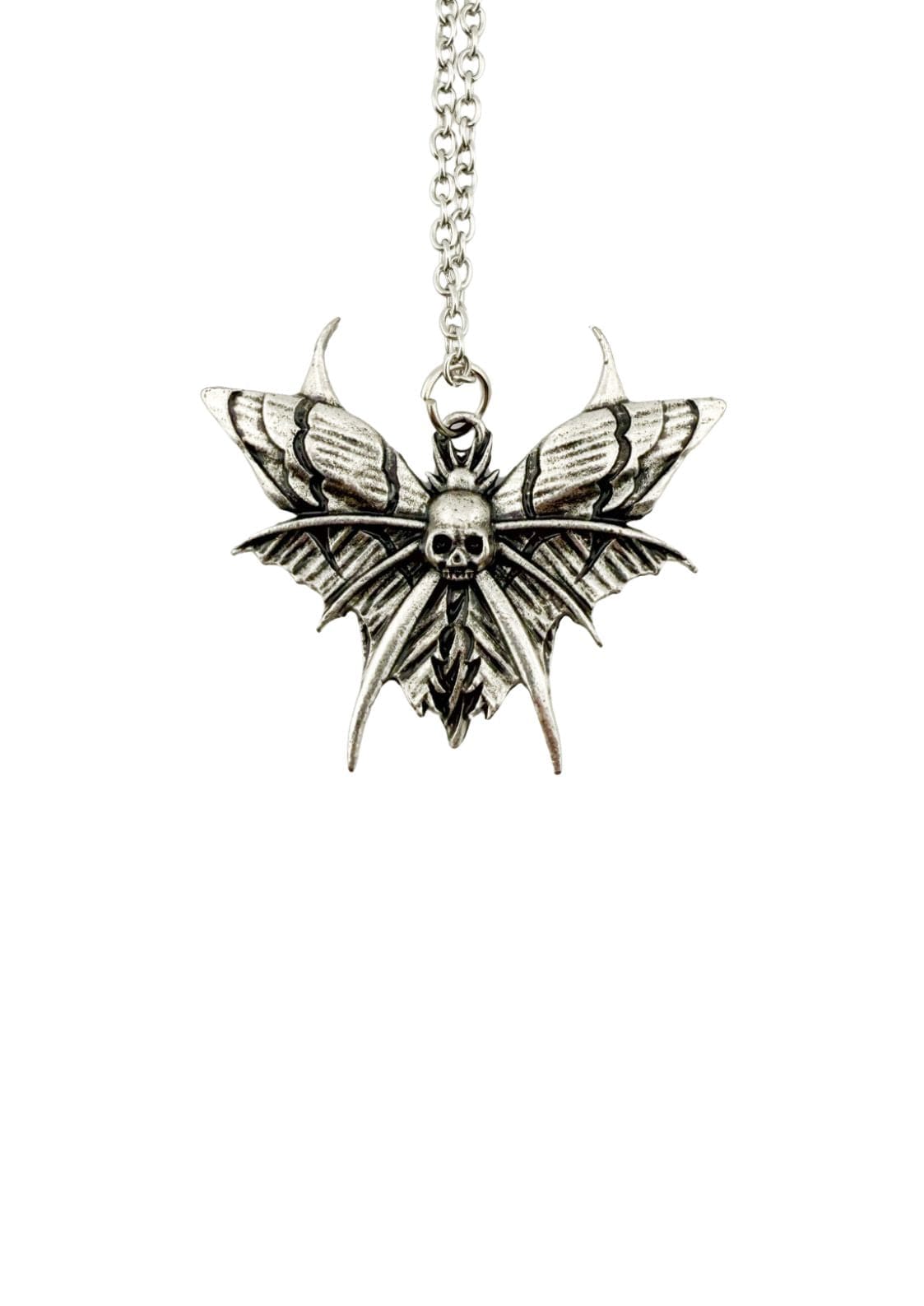Düstere Halskette mit detailliertem Mottendesign und Totenkopf auf der Rückseite. Hochwertige Metallverarbeitung verleiht diesem Gothic-Schmuckstück eine authentische, rebellische Ausstrahlung. Das perfekte Accessoire für alle, die ihre dunkle Ästhetik unterstreichen möchten.