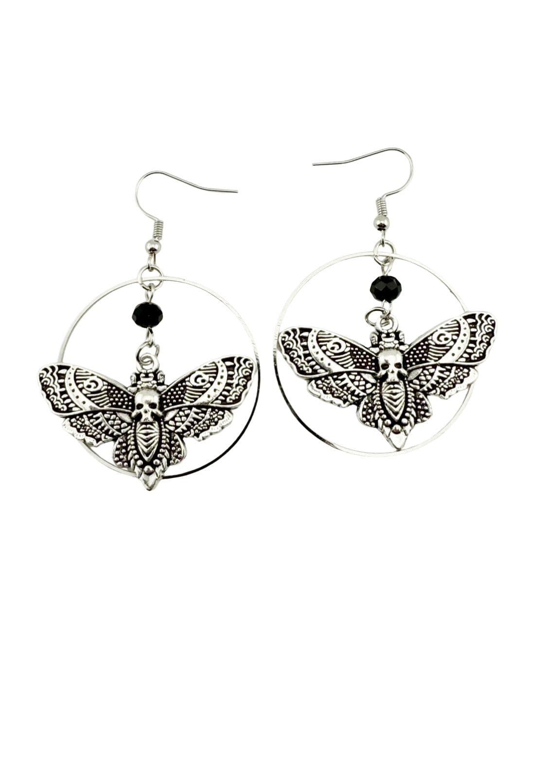 The CIRCLE MOTH earrings feature a delicate moth encircled by a minimalist metal circle. The small black stone adds a subtle, dark accent, lending the design a mysterious depth. A statement piece for those who appreciate the beauty of the night and its inhabitants.
