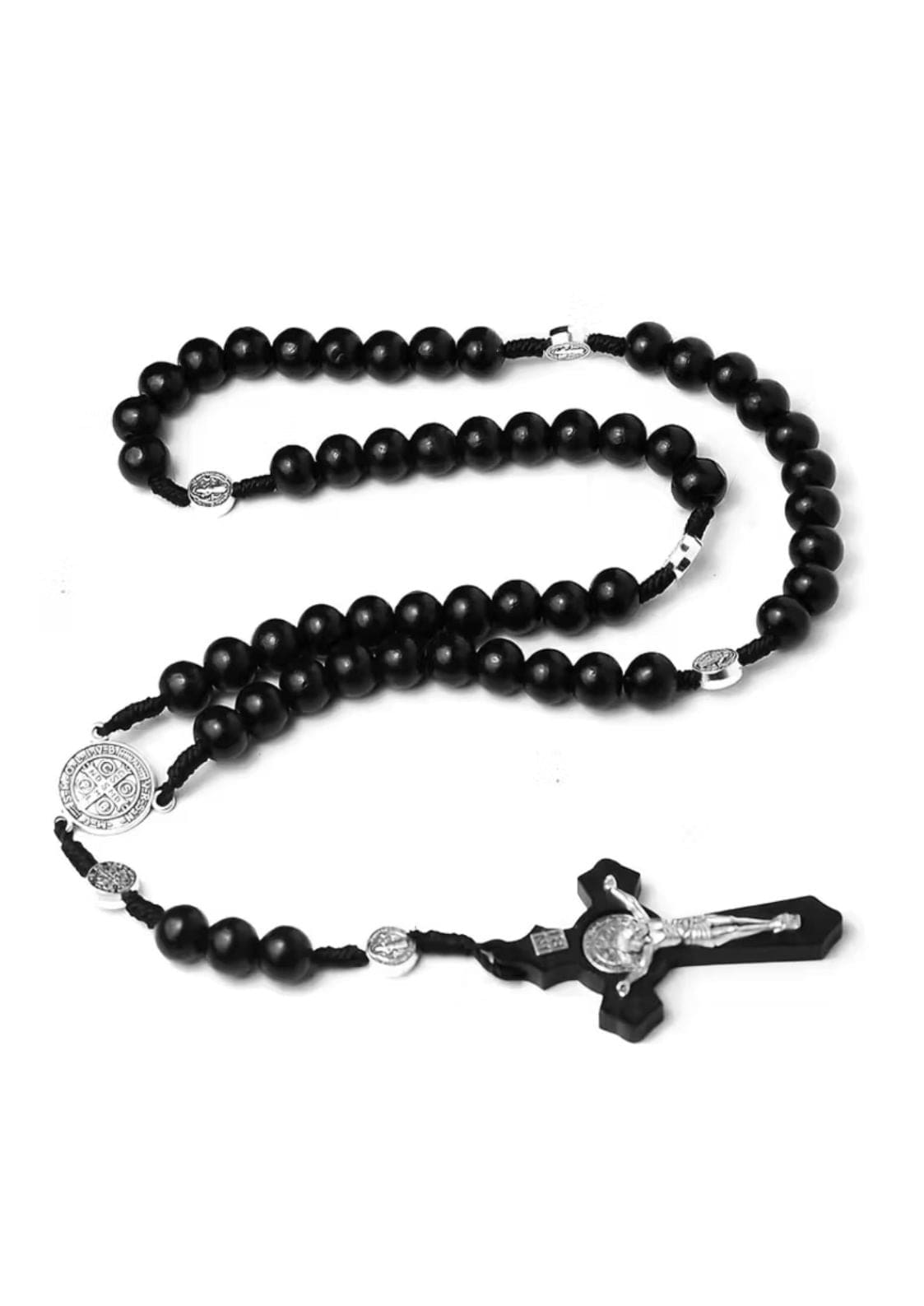 This somber rosary blends Gothic aesthetics with handcrafted elegance. Black wooden beads form a harmonious chain, punctuated by a magnificent wooden cross with a silver figure as its spiritual center. The material lends the piece a natural, timeless appeal. A rosary for those who wish to combine tradition with a modern, dark style.