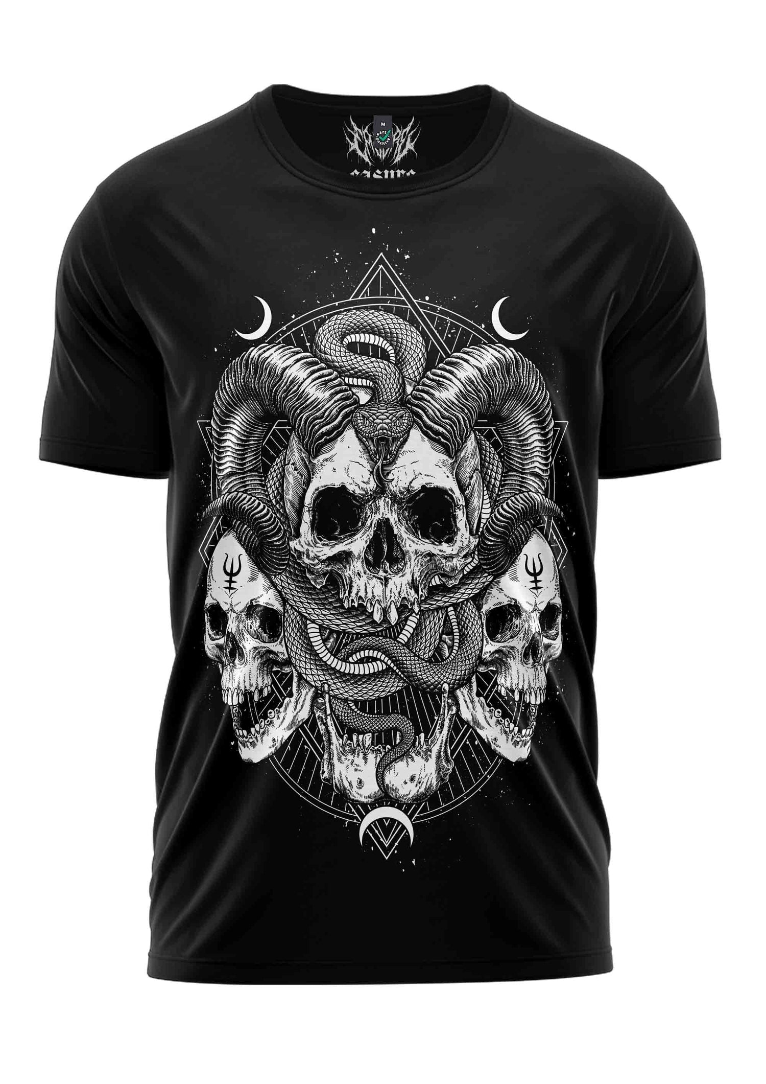 Düsteres Statement-Piece aus 100% Baumwolle (Bio-Baumwolle) mit drei Schädeln, die von einer Schlange umwunden sind. Das kraftvolle Design verkörpert Rebellion und mystische Energie – perfekt für alle, die ihre dunkle Seite zeigen möchten. Nachhaltig produziert, angenehm zu tragen und garantiert ein Blickfang.