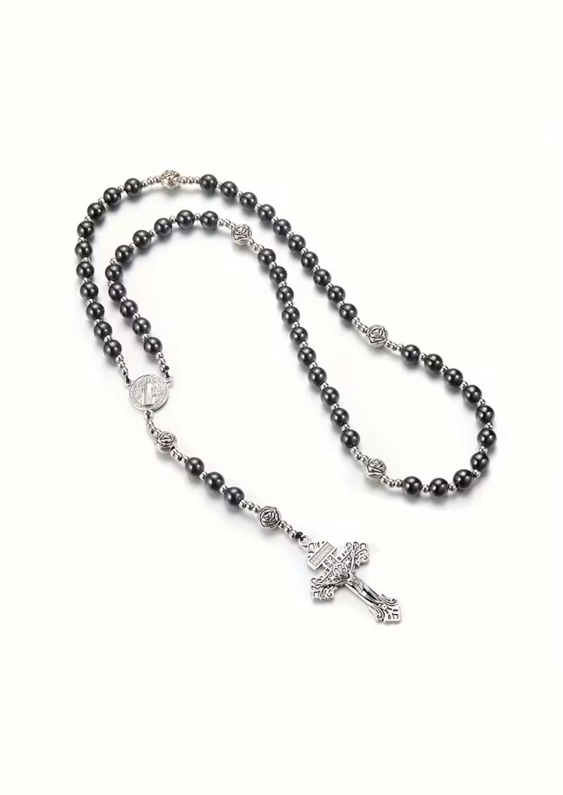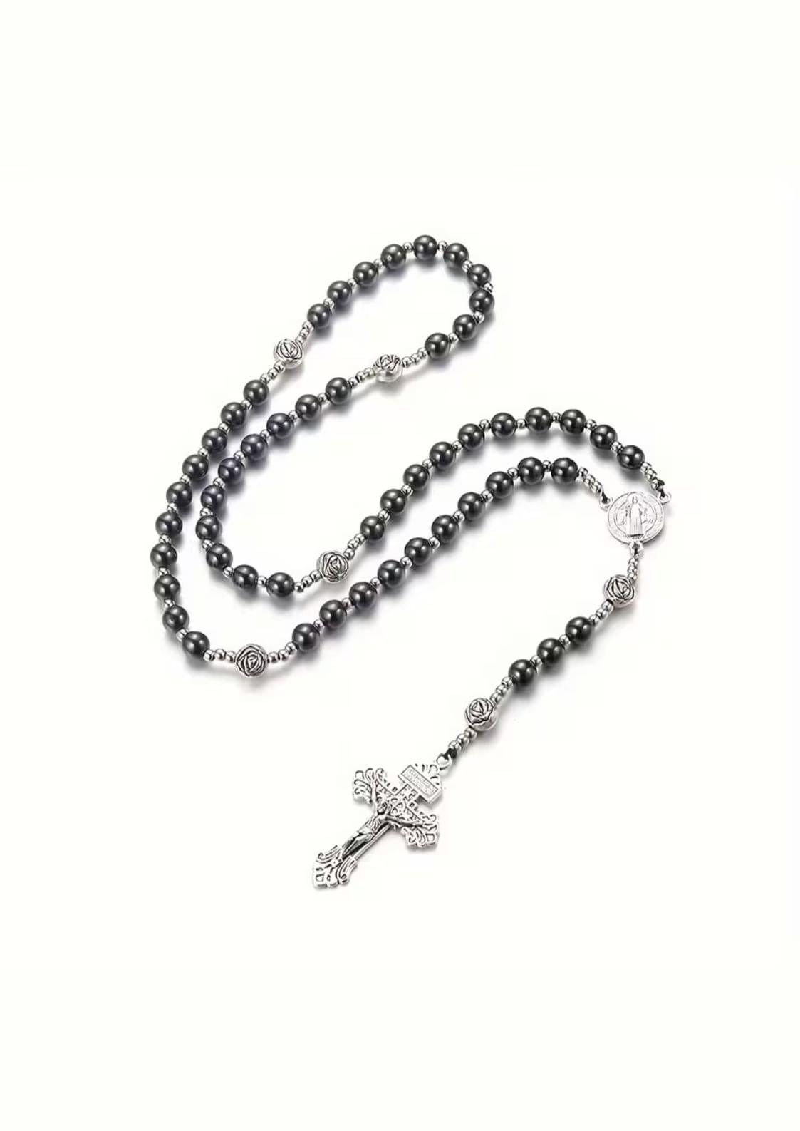 Dieser düstere Rosenkranz vereint gotische Ästhetik mit massiver Präsenz. Das Kreuz aus robustem Edelstahl in gunmetal-grau strahlt eine geheimnisvolle, unverwechselbare Ausstrahlung aus. Die schwere Verarbeitung unterstreicht die kraftvolle Symbolik und macht dieses Stück zu einem Statement für alle, die sich zur dunklen Seite der Spiritualität hingezogen fühlen.
