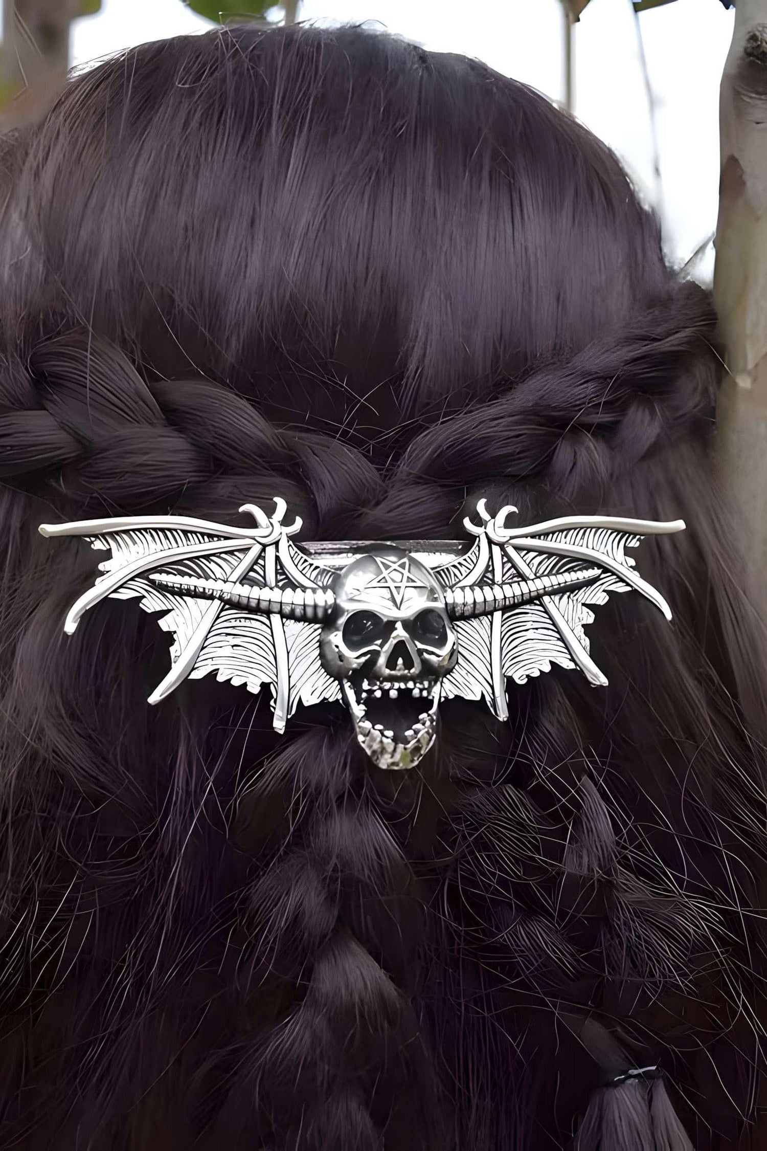 Der Totenkopf mit Pentagramm auf der Stirn ist umgeben von detailliert ausgearbeiteten Flügeln. Diese Haarklammer ergänzt alle düsteren Outfits und bändigt deine Frisur.