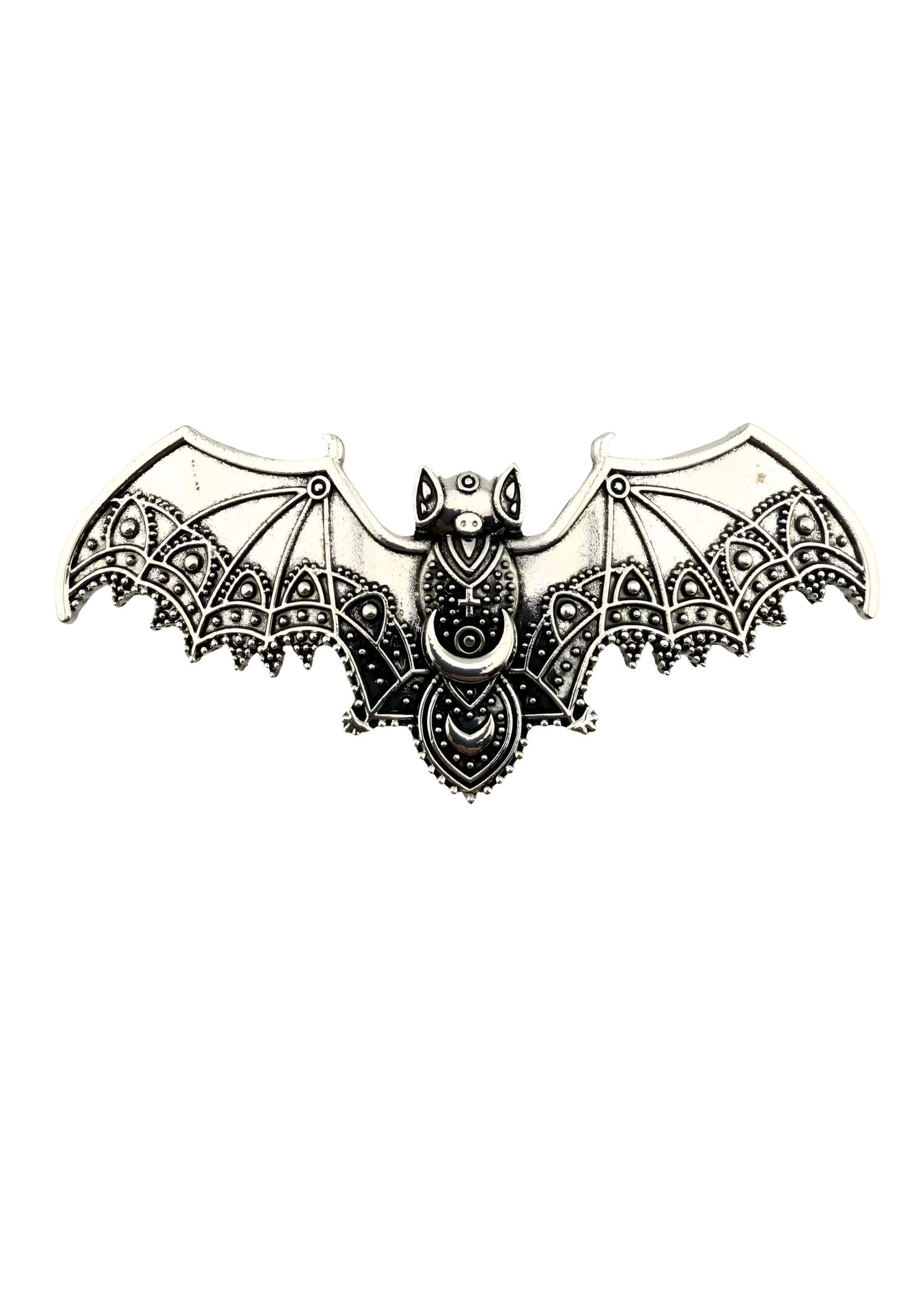 Düstere Edelstahl-Haarklammer mit gotischem Fledermaus-Design und kunstvollen Mandala-Mustern auf den Flügeln. Das aufwendig gestaltete Motiv verbindet mystische Symbolik mit feinen Details – ein visuelles Statement für alle, die Dunkelheit und Eleganz lieben. Robust verarbeitet für sicheren Halt und zeitlosen Style.