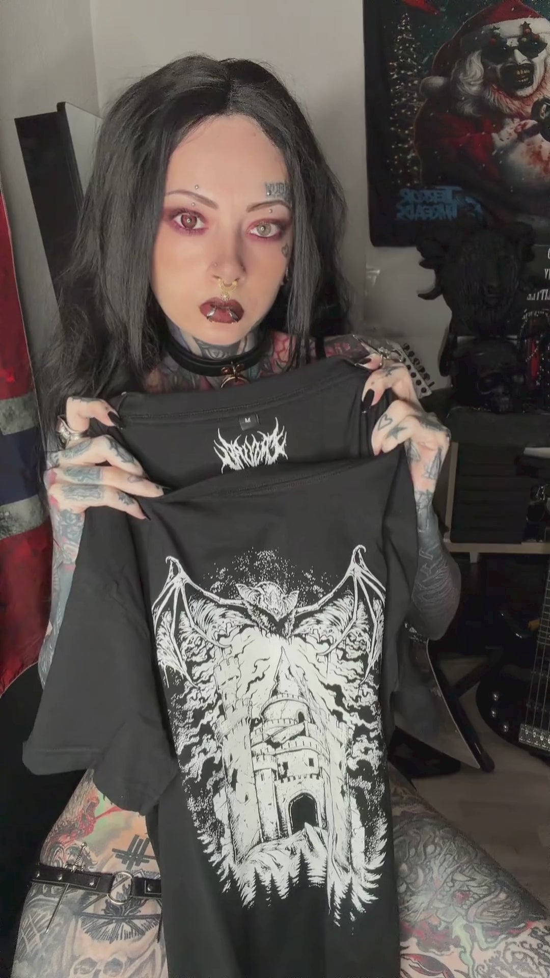 Düsteres Shirt aus 100% Baumwolle (Bio-Baumwolle) mit eigenem Design: Eine verfallene Burganlage im Wald, dominiert von einer imposanten Fledermaus. Das Motiv verbindet gotische Ästhetik mit natürlicher Eleganz – perfekt für alle, die düstere Atmosphäre und Nachhaltigkeit schätzen.